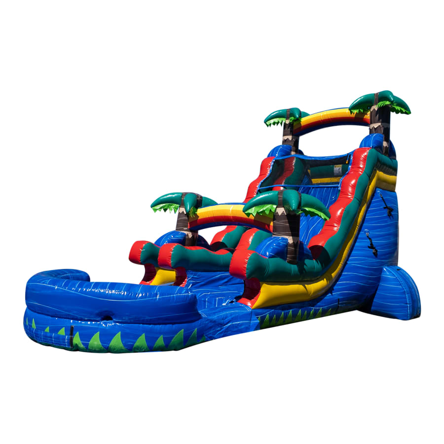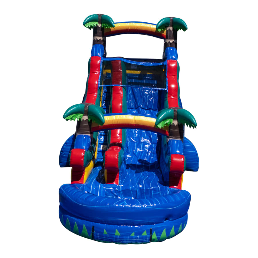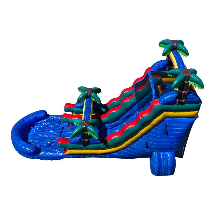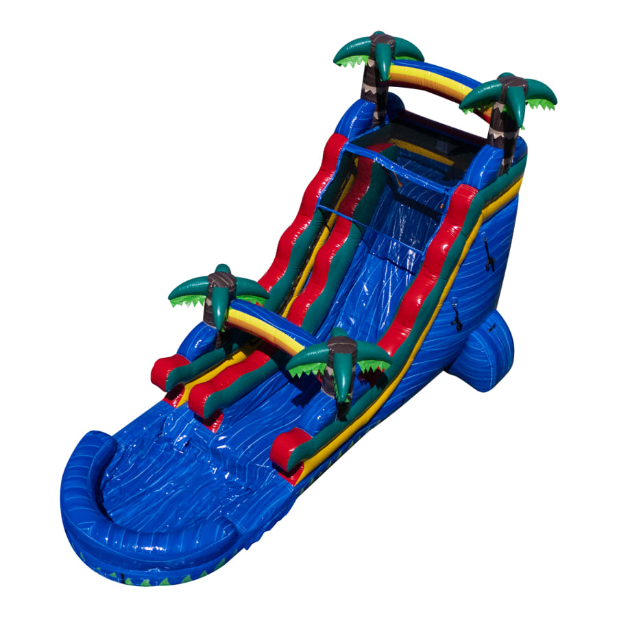 This slide is not just your average water slide. It’s a paradise waiting to be explored! With its 18-foot height, it offers a thrilling drop that will leave you craving for more. The bright blue color adds a touch of tropical fun to any party or event.