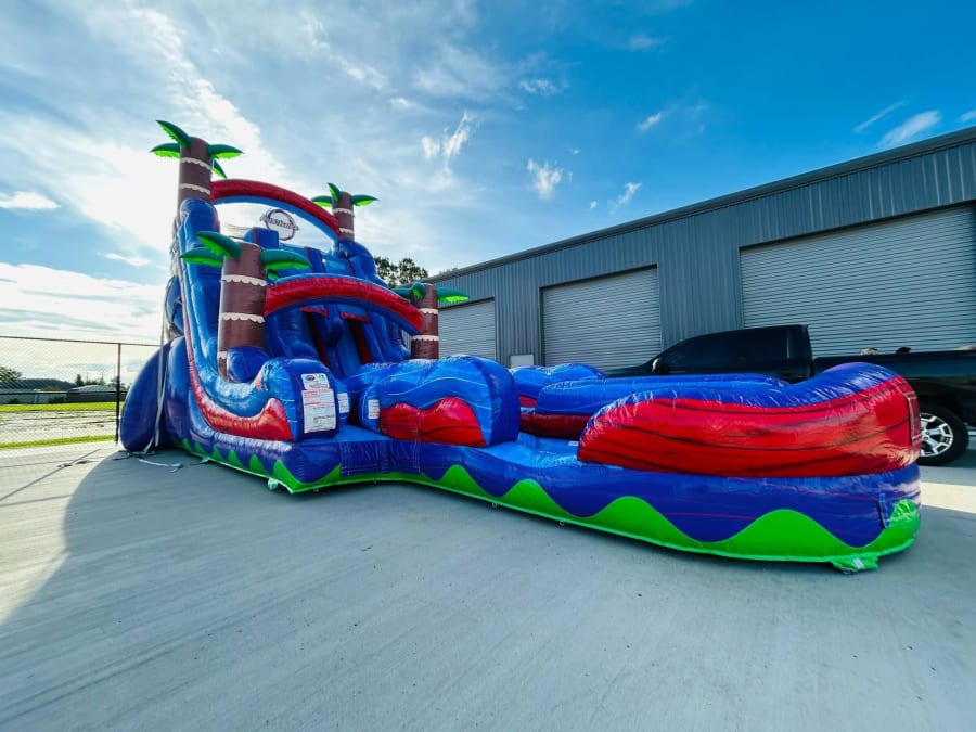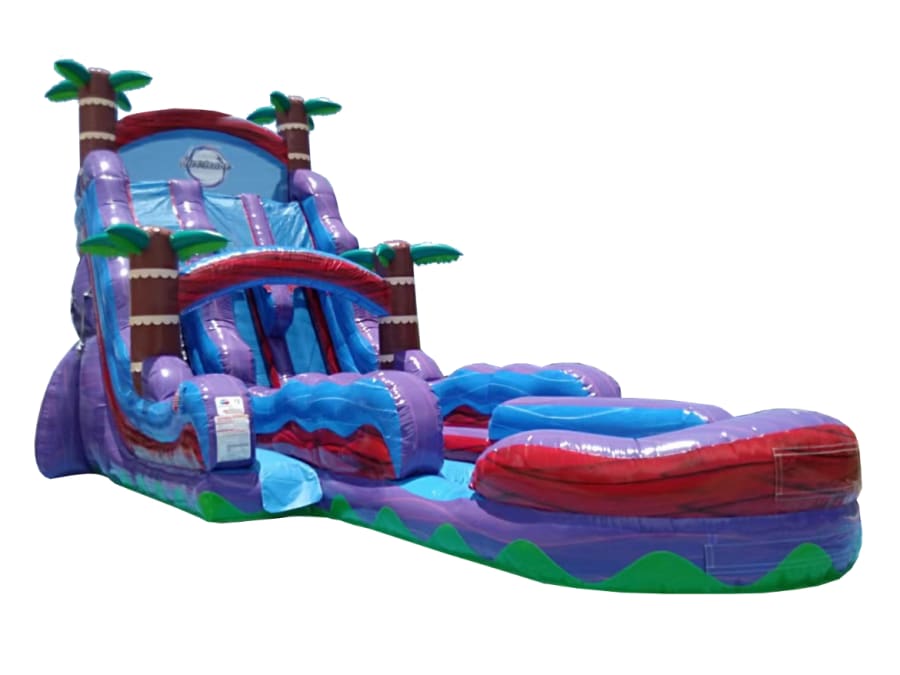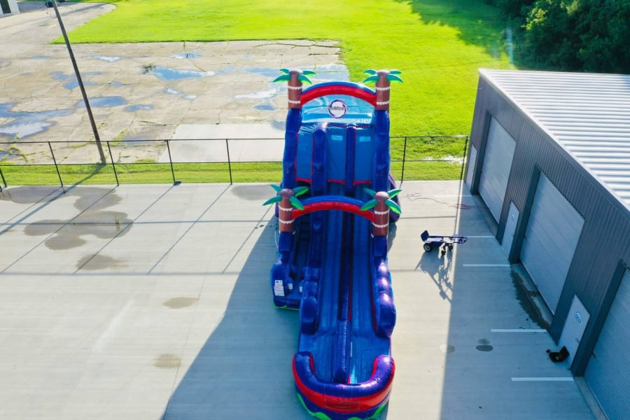 The 22’ Dual Lane Hurricane features two extra-wide sliding lanes, allowing guests to race side by side for nonstop action. Towering at 22 feet, its impressive height and eye-catching design make it the star attraction at any event. The vibrant colors and wave-inspired details create an immersive, tropical vibe that everyone will love.