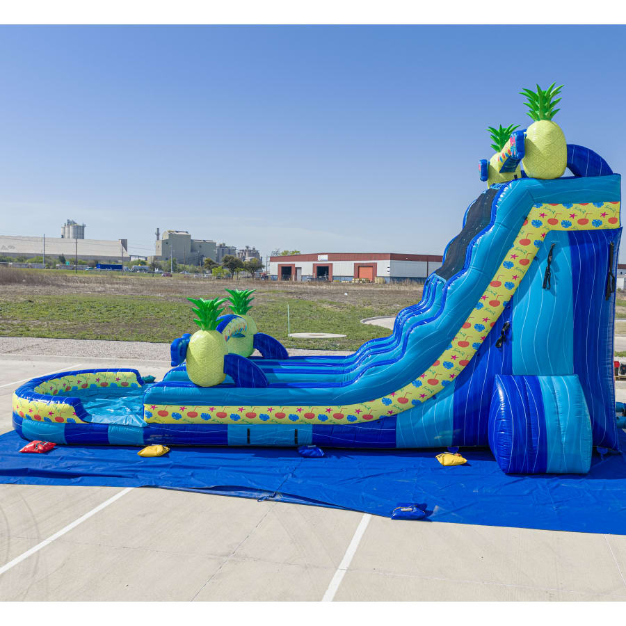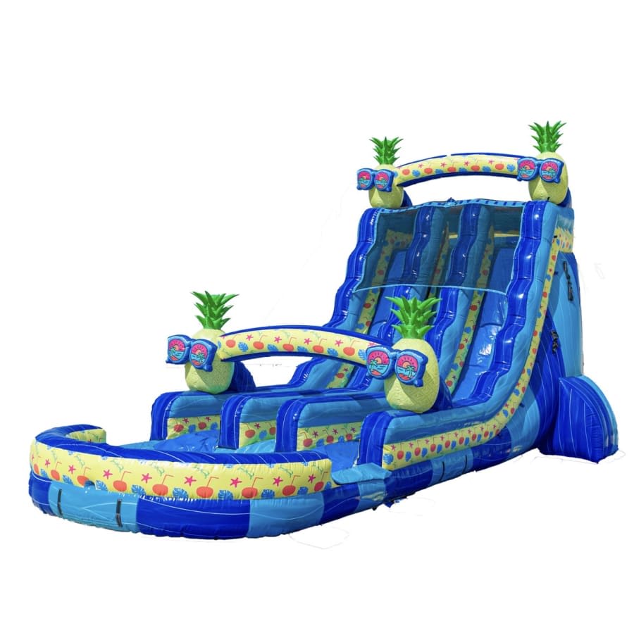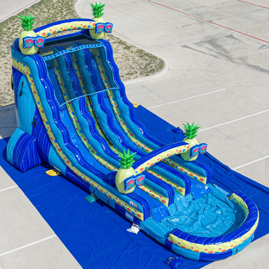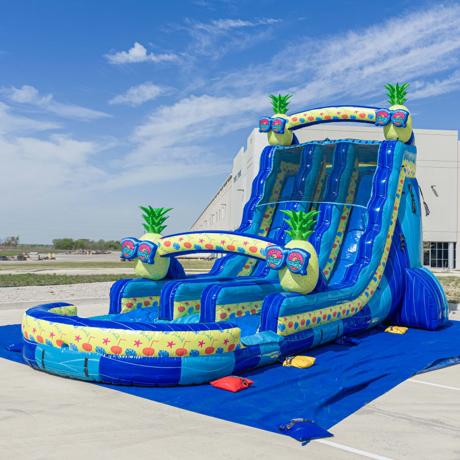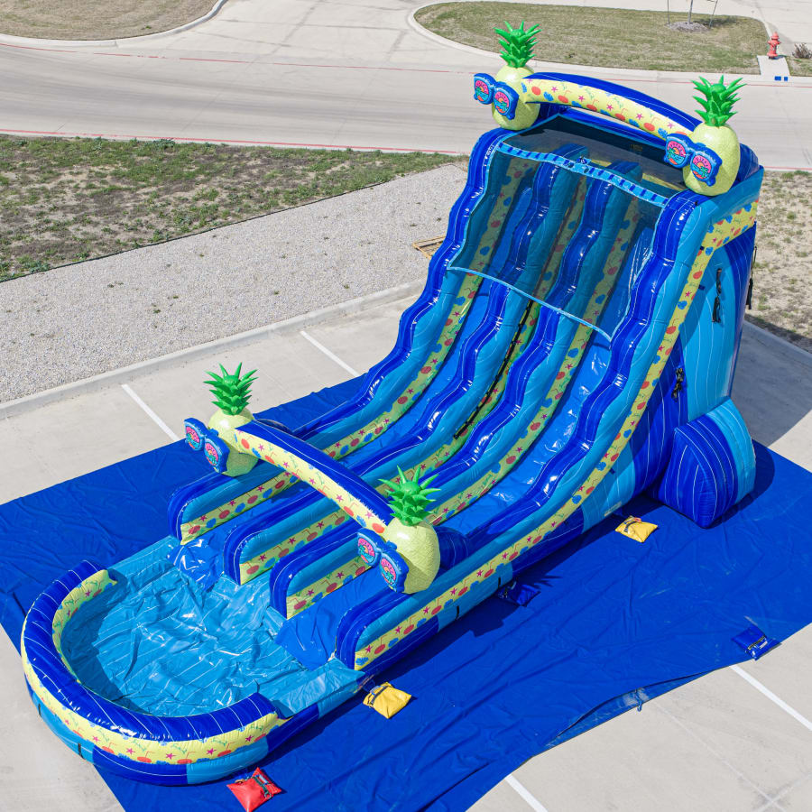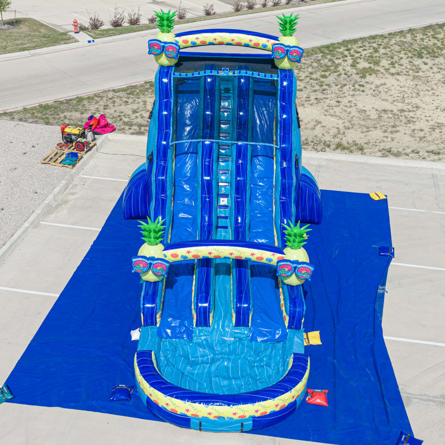 The 22’ Pineapple Drop delivers high-energy summer thrills. This eye-catching, pineapple-themed waterslide stands 22 feet tall and features two fast lanes for head-to-head racing. It’s perfect for birthday parties, community events, church picnics, and backyard rentals. Bright colors and a tropical design boost party photos and create instant excitement. Safe. Fast. Memorable.